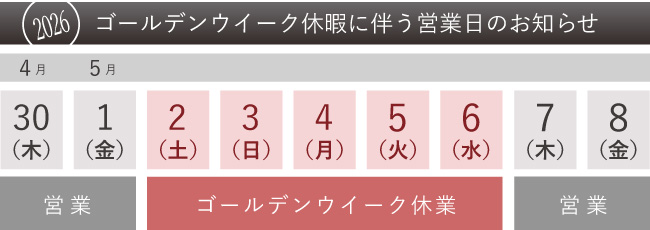 お休み日程 :2026年 5月2日(土)~2026年 5月6日(水)まで