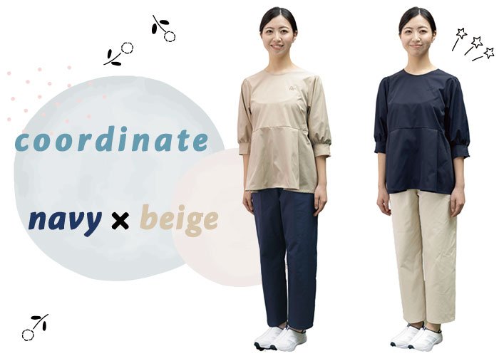 trim.ウェアはネイビーとベージュの2色展開。トップスとパンツはそれぞれ2サイズ展開。男女兼用のオーバーシャツもご用意しました。