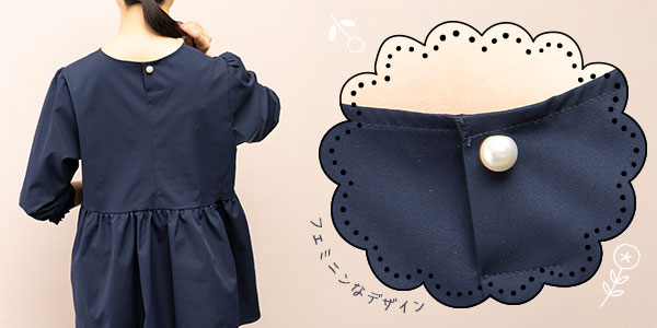 後ろ首元にあしらったパールボタンとギャザーが、シンプルながらも女性らしさを際立たせ、フェミニンでエレガントな印象を与えるデザインです。