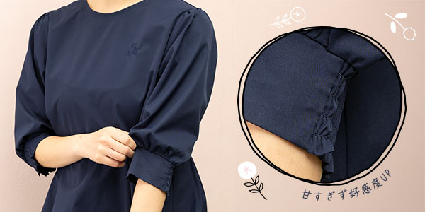 後ろ首元にあしらったパールボタンとギャザーが、シンプルながらも女性らしさを際立たせ、フェミニンでエレガントな印象を与えるデザインです。